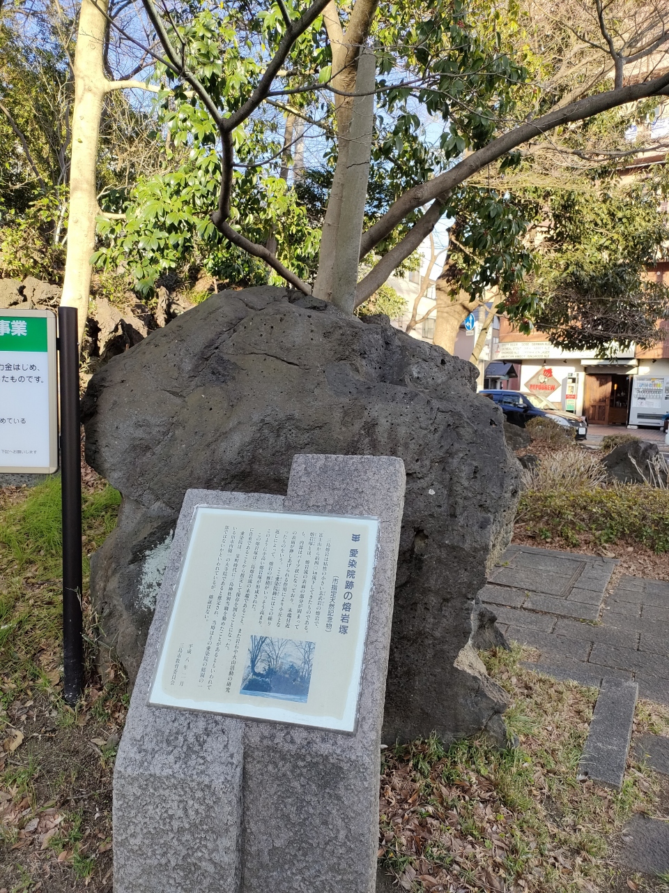 三島駅を大通り沿いに南下し、市民文化会館左手にあります。愛染院は真言宗の寺院で愛染明王を祀る名に因んで付けられたものですが、その院の跡地です。市内至る所に見られる溶岩ですが、富士山の噴火で流れ出たものでここでも見られます。