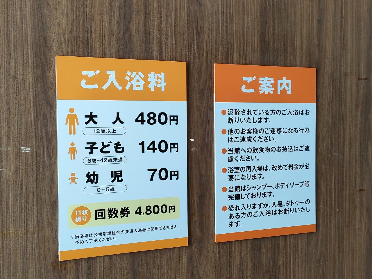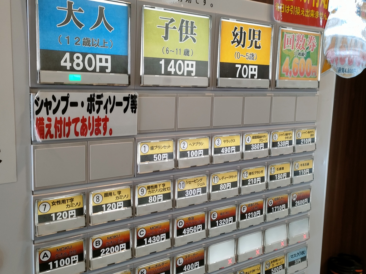 通常料金は¥480円で、シャンプーやボディーソープなどの備え付けがあります。そのほかオプションで、タオル、カミソリ、歯ブラシなどの販売もあったので、手ぶらで訪れることもできそうです。