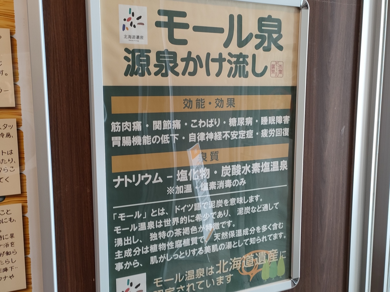 新札幌駅に近い街中の日帰り入浴施設ですが、ここは天然のモール温泉に浸かれます。pH7.8のナトリウム―塩化物・炭酸水素塩温泉で、お湯に浸かると、肌がツルツルというか、ヌルっとしたような感覚さえ覚えます。ブラックコーヒーのような濃い黒褐色のお湯で、内湯の一部と露天風呂がモール湯となっていました。