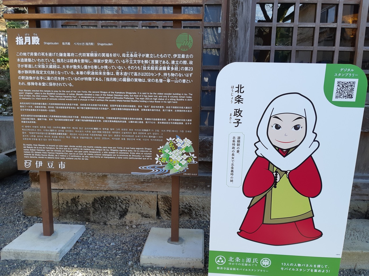 修禅寺の川を挟んだ向こう側の小高い場所にあります。修善寺には何回か行ってますが、初めて訪ねたこの指月殿は、若くして亡くなった息子の源頼家を弔う為に北条政子が建立したそうです。伊豆最古の木造建築とか。賑やかな川沿いとはうって変わり、とても静かな場所に佇んでいて空気が変わる様な気がして、悲しみが増します。鎌倉2代将軍なのに暗殺されてしまうなんて政子の悲しみはいかばかりだったか。外からでも金色に輝く釈迦如来坐像が見え、右手に蓮の花を持つ釈迦如来はとても珍しいとか。ここの絵馬は自動販売機でビックリしました。隣には頼家のお墓や家臣の十三士の墓もあります。