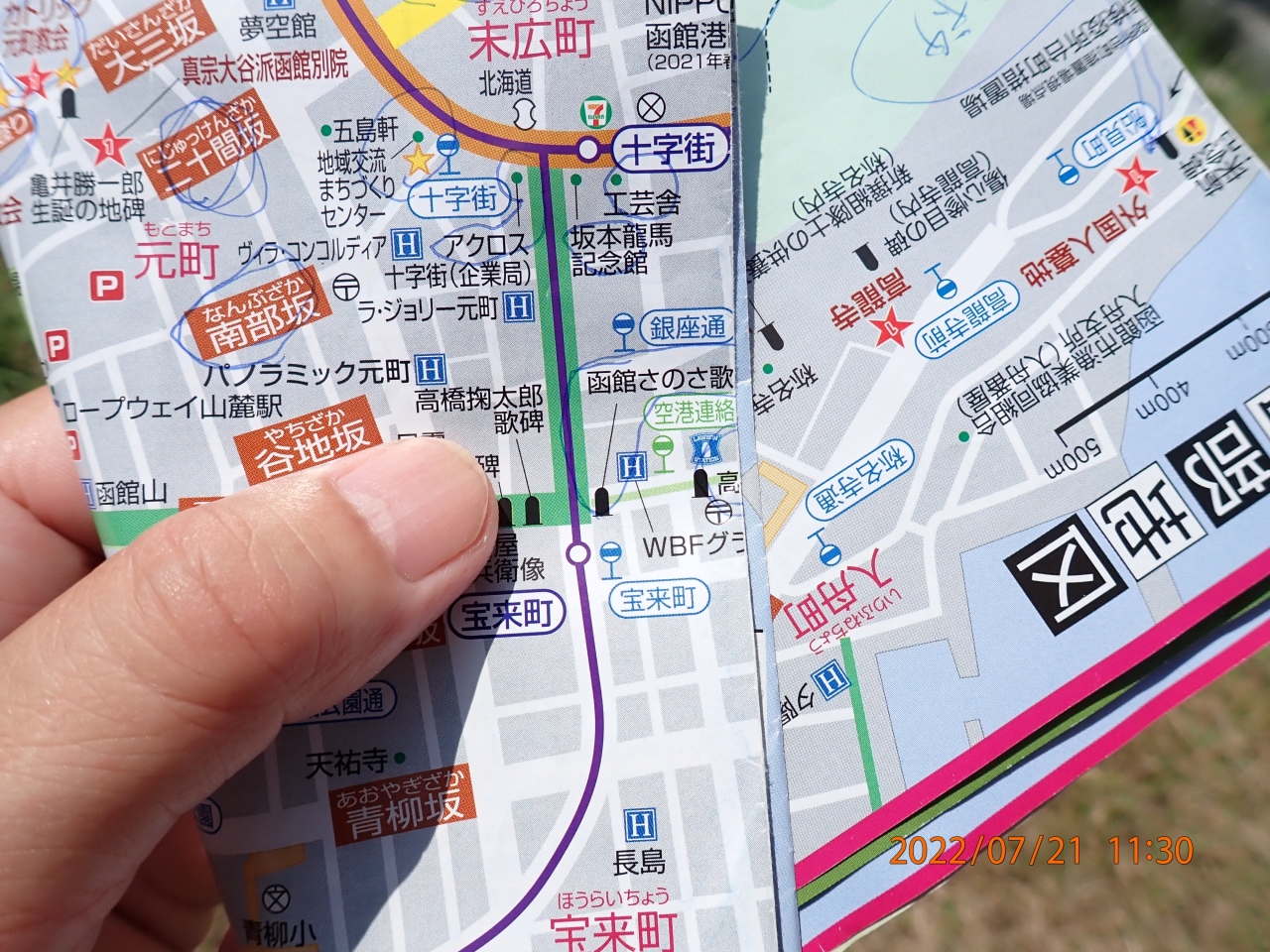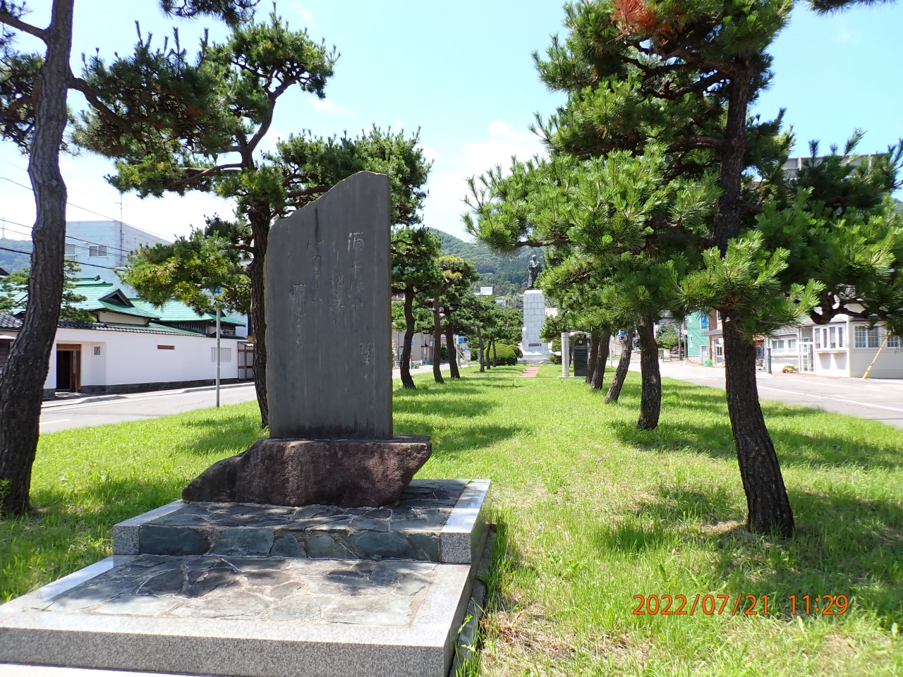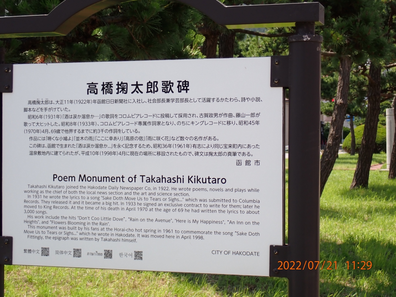 函館市観光で立ち寄りました。高橋掬太郎の歌碑は、函館市電の宝来町電停すぐ近くにあります。函館護国神社に上って行く坂の入り口の道路の中央分離帯に建っています。説明板によると、高橋掬太郎さんは、函館日日新聞社の社会部長兼学芸部長として活躍するかたわら、詩や小説、脚本などを手掛けていたそうで、「酒は涙かため息か・・・」の他、多数のヒット曲の作詞をされたそうです。