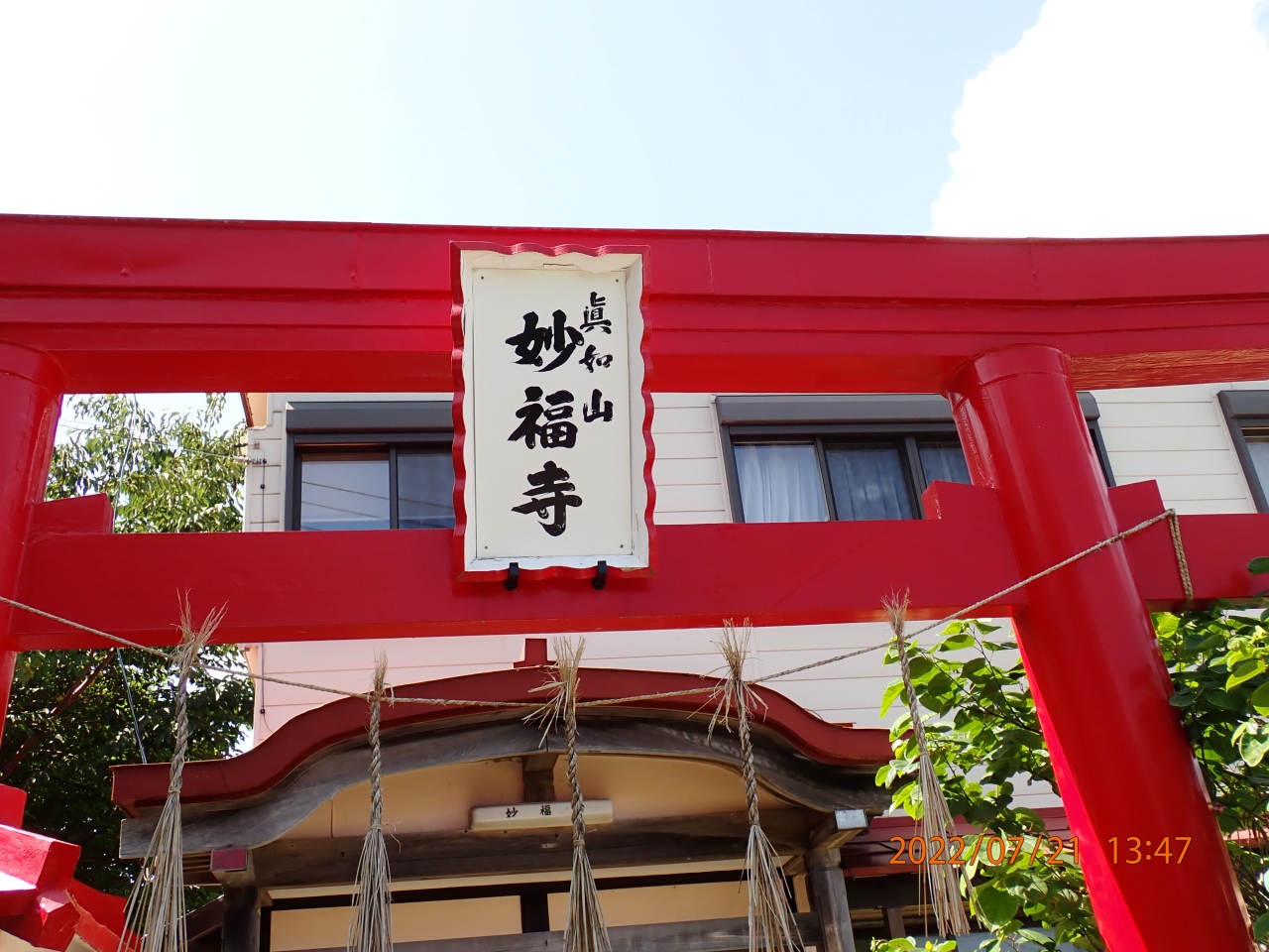 函館市観光で立ち寄りました。妙福寺は、元町配水場の北にあったお寺ですが、入り口に朱色の鳥居がありびっくりでした。理由は簡単で、同じ敷地に、妙福寺と久遠稲荷大明神が建っていたからでした。とは言え、朱色の鳥居に「妙福寺」と明記してあるので、勘違いしてしまいます。お寺の建物は唐破風スタイルで、お寺らしい建物でした。