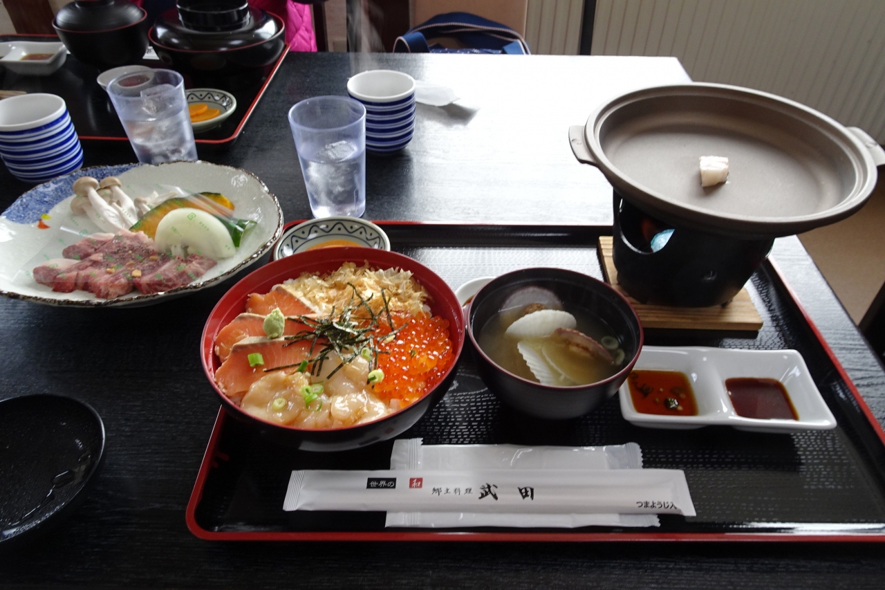 ツァーの昼食で寄りました。一昨年は秋、確か、鮭三代どんぶりと毛蟹半身でしたが、毛蟹半身が標津牛の陶板焼きに変更になっていました。ツァーのレベルは同じですが、今回のほうがレベル高かったです。日頃はサーモン好きではありません(食べれないことはない・日好んで食べることはない)が、非常に美味しく感じました。