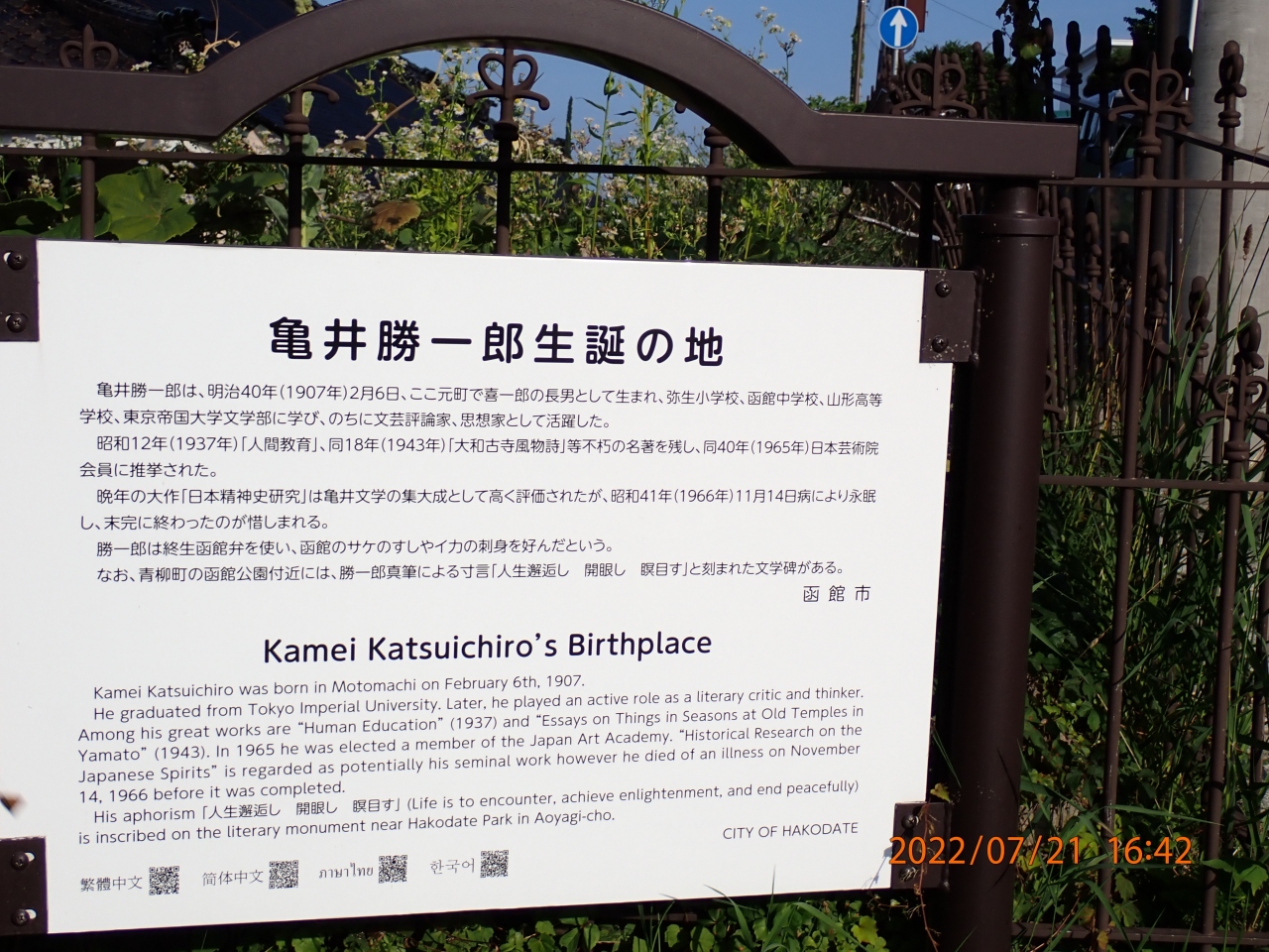 函館市観光で立ち寄りました。亀井勝一郎生誕の地碑は、日本の道100選で有名な大三坂沿いにあり、日本で最も古い3つの教会の一つであるカトリック元町教会の向かい側に建っています。説明板によると、亀井勝一郎さんは、元町生まれだそうで、1907年に喜一郎さんの長男として生まれたとのことです。