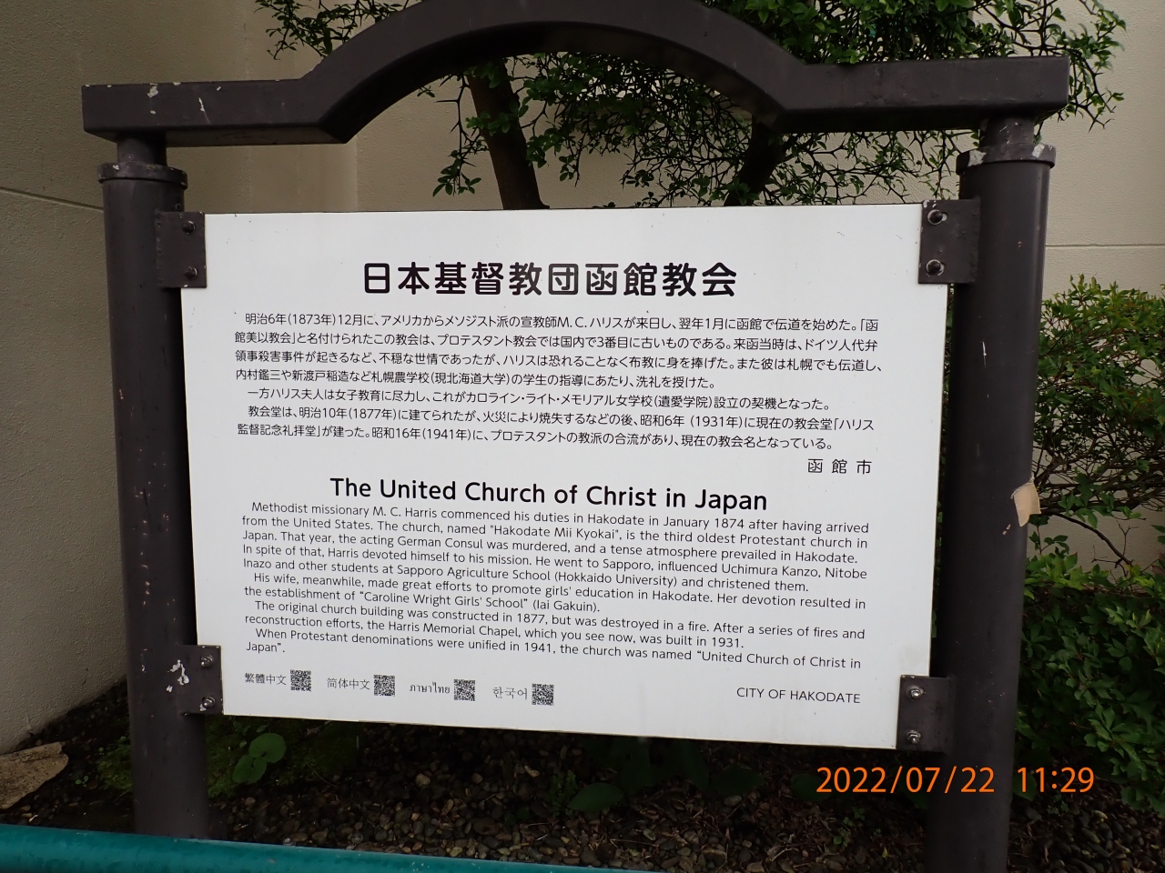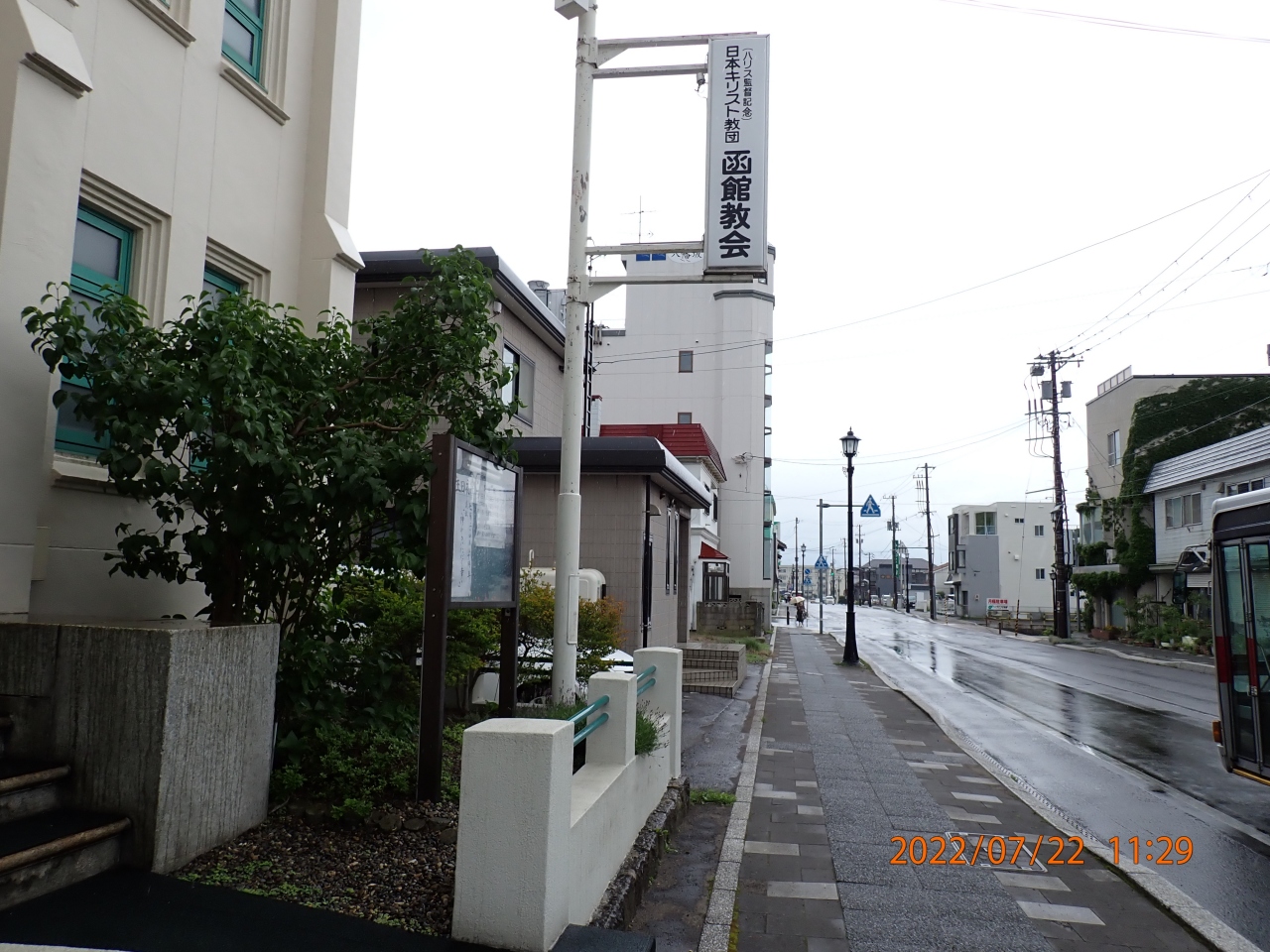 函館市観光で立ち寄りました。日本キリスト教団 函館教会は、ベイエリアの八幡坂近くにあったメソジスト派の教会でした。説明板によると、明治6年にアメリカからメソジスト派の宣教師が来日し、伝道をはじめたそうで、「函館美似教会」と言う名前だったそうです。プロテスタントの教会としては日本で3番目に古いとのことです。