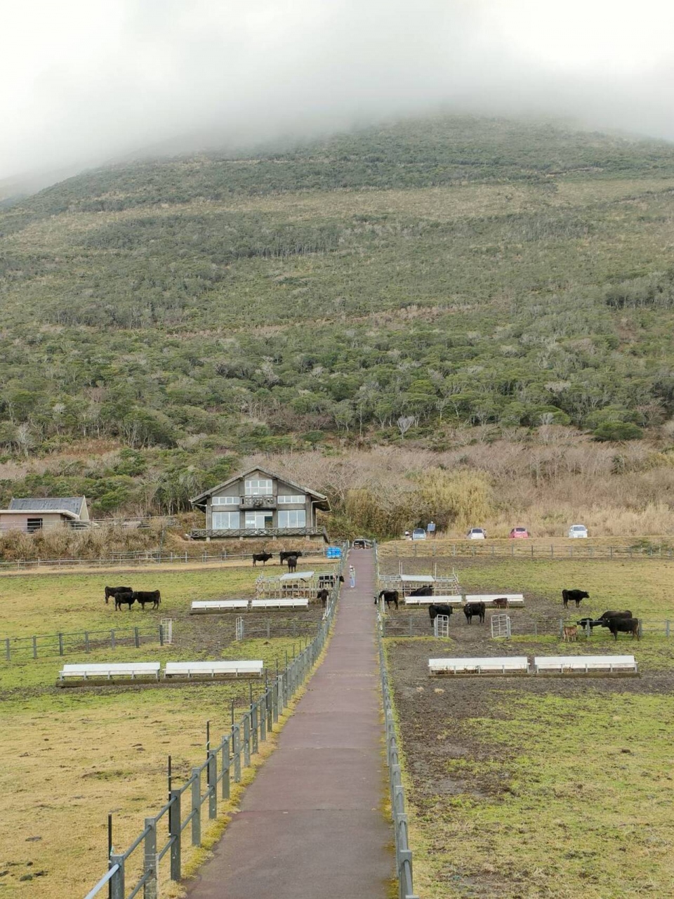 山の中腹にふれあい牧場、そして展望台があります。あいにくの天気でとても寒く、風も強いし、雲がかかっててっぺんが見えない状態でしたが、山の中腹のふれあい牧場ではのびのびと暮らしている牛さんたちを見られて癒やされました。