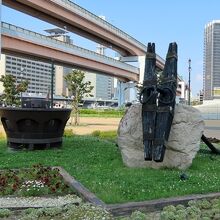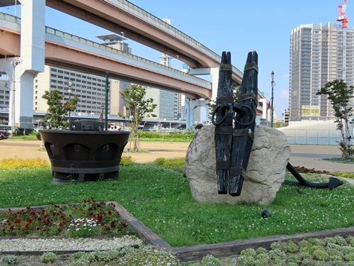 探検家コロンブスが乗っていたサンタマリア号がなぜここに??? 実はコロンブスの新大陸発見500年を記念の年の1992年に、スペイン政府の企画としてサンタマリア号を復元、黄金の国ジパングへ到達するというイベントがあったのだそうです。展示されているのはそのときの望楼とアンカーなのでした。
