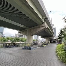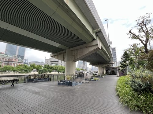 堂島川の北岸、天満警察署の交差点、鉾流橋北詰あたりから西天満若松浜公園に下りていくとリバーサイドにレストランがありました。公園ともショッピングモールとも言えない感じでしょうか。それより警察署前の大きな鳥居が不思議でしたが大阪天満宮の「鉾流神事」の場所でした。いずれにせよ阪神高速の高架が情緒を阻害している気がしました。
