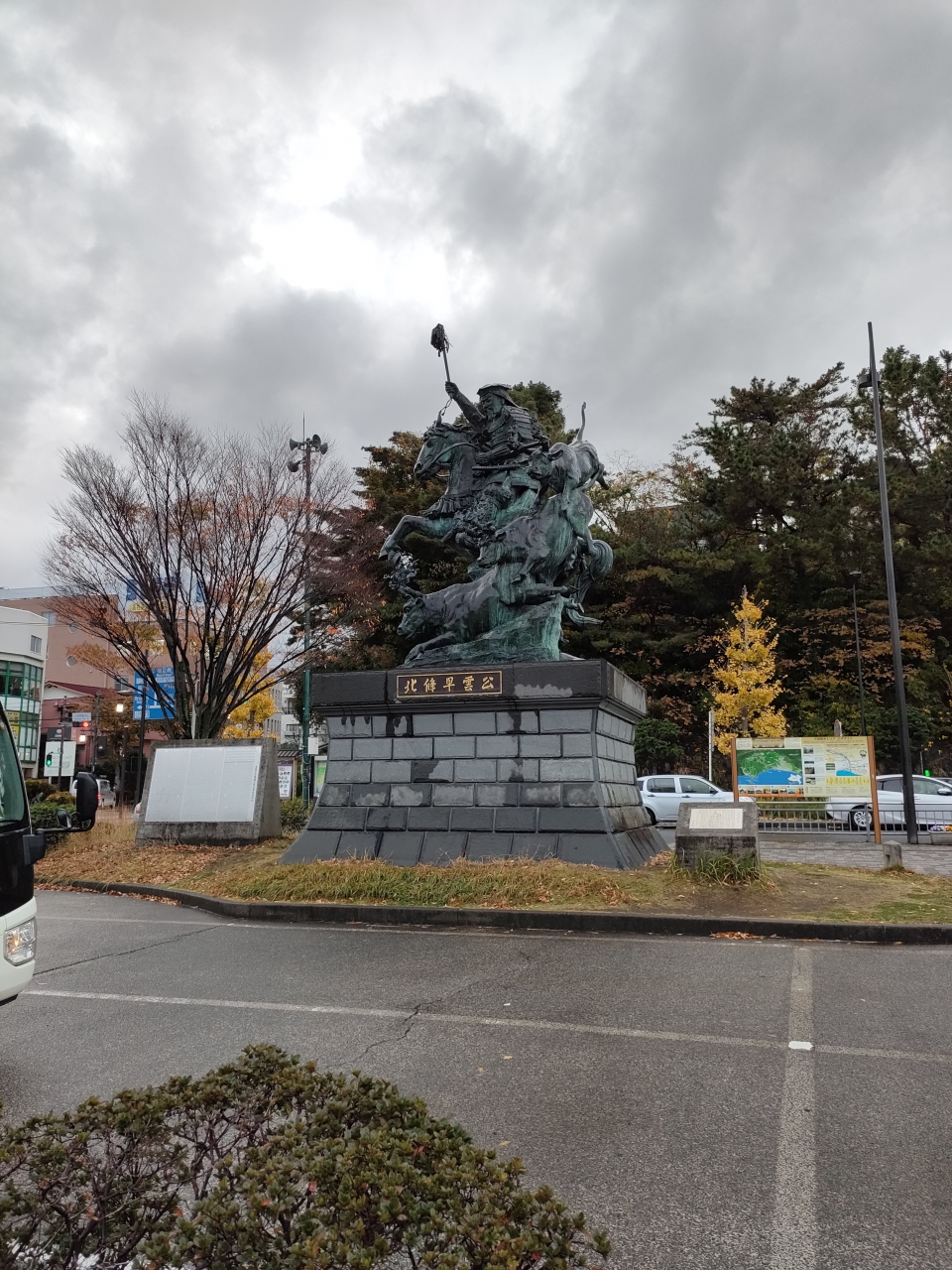 小田原駅西口ロータリーの中央にある銅像です。高さ5.7m、重さ7tと巨大です。これほどの大きな銅像、小田原に北条氏ありと、市を挙げて取り組んだのでしょう。見せかけの夜襲攻めに一役買った牛も共にしています。