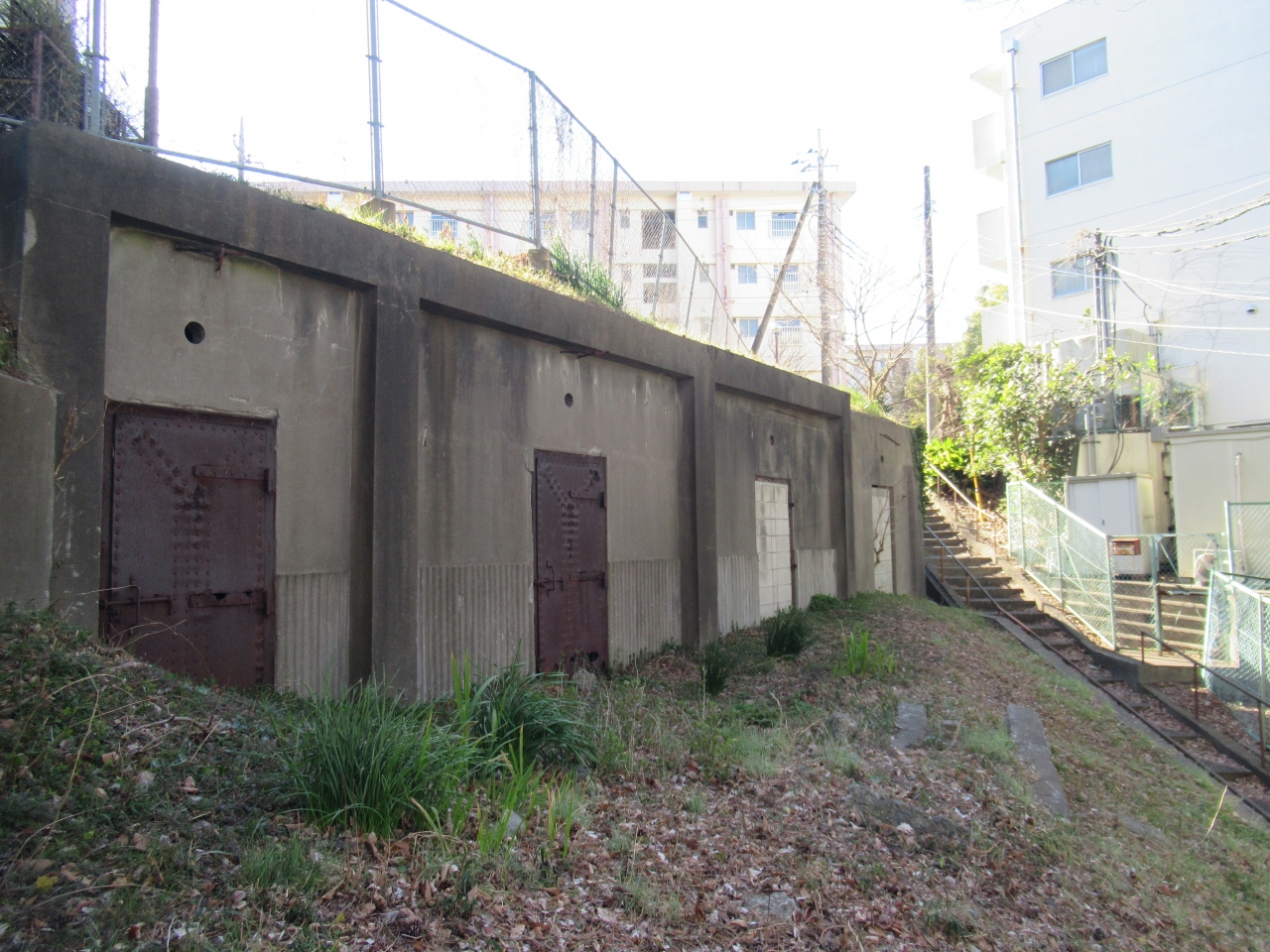 松戸駅東口のプラーレ松戸前の道路を北へ歩いた右側に狭い階段があります。階段の上には閉鎖された団地が建っています。階段の途中、団地の土台部分にコンクリートの建造物があります。これが陸軍工兵学校倉庫跡です。階段脇に欠けている境界杭があります。説明板はありません。裁判所横の小学校近くにも陸軍の境界杭がありました。現在の松戸中央公園を中心に陸軍工兵学校の敷地が広かったことがわかります。立入禁止フェンスで囲まれている団地はいずれ解体されるでしょう。倉庫跡はどうなるのか気になります。