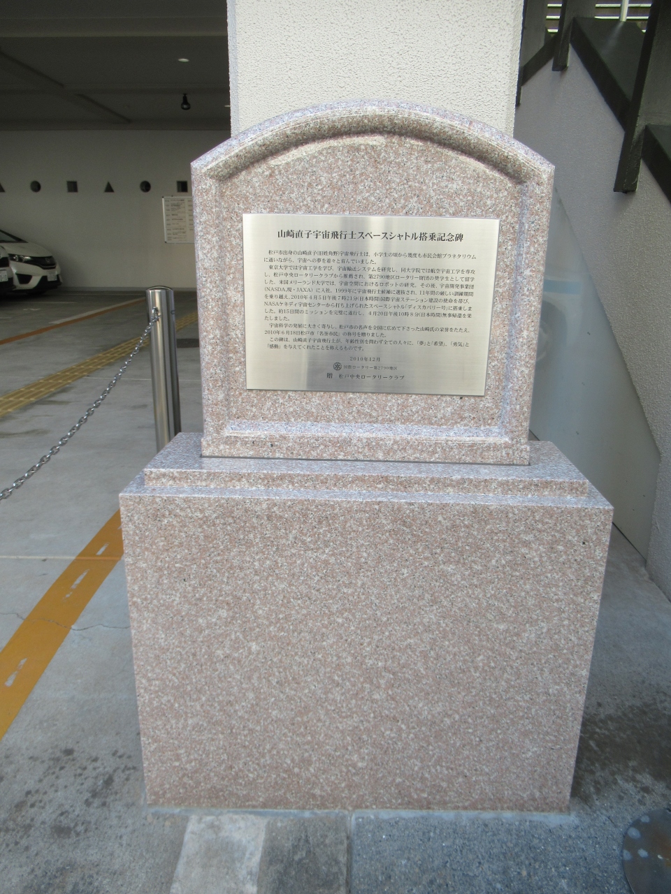 松戸駅東口から8分ほど南へ歩いたところに建つ市民会館に入る階段横にあります。松戸市出身で、小学生の頃から市民会館プラネタリウムに通った山崎直子宇宙飛行士の栄誉を称え、松戸市名誉市民になった2010年に建立された石碑です。松戸市のロータリークラブの推薦で奨学生として留学したことや、スペースシャトルに搭乗したことなどが記されています。磨かれたきれいな石碑です。記念碑を見てから、プラネタリウムを観賞しました。