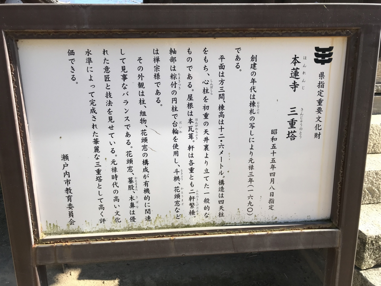 本蓮寺は、古くから風待ち、潮待ちの港町として栄えた牛窓の少し小高い場所にありました。室町時代の明応元年(1492年)に再建された本堂は国指定の重要文化財になっていました。本堂の隣にある祖師堂も本堂に劣らず堂々たる建物でした。境内の港側に建っている華麗な三重塔は元禄時代の建物で花頭窓、蟇股、木鼻の優れた技法を見ることができました。