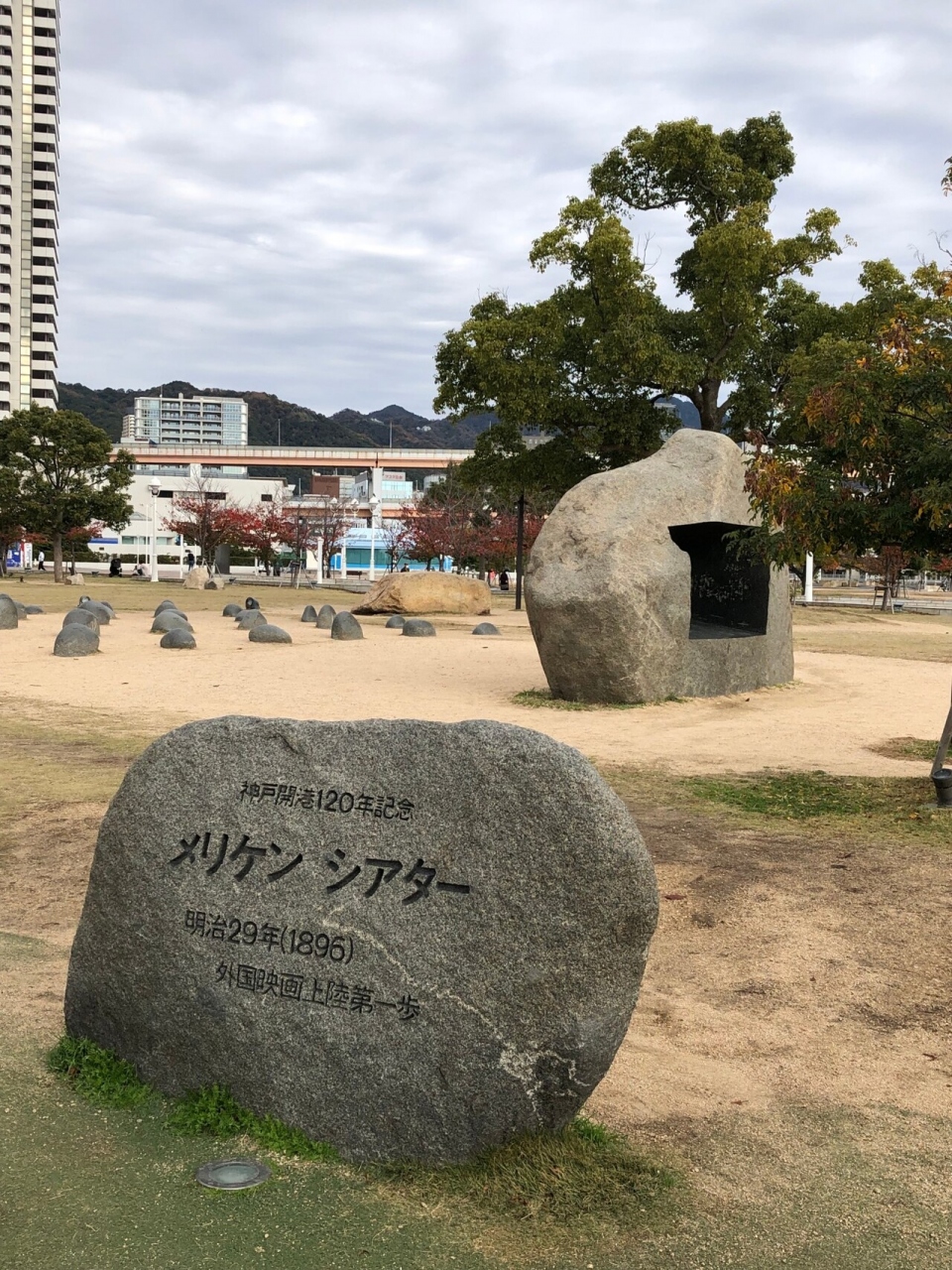 外国からの映画がはじめてはいってきたことを教えてくれる史跡でした。椅子に見立てた小さな石とスクリーンに見立てたおおきな石に四角く穴をあけたものがあり、存在感を放っているなと思いました。