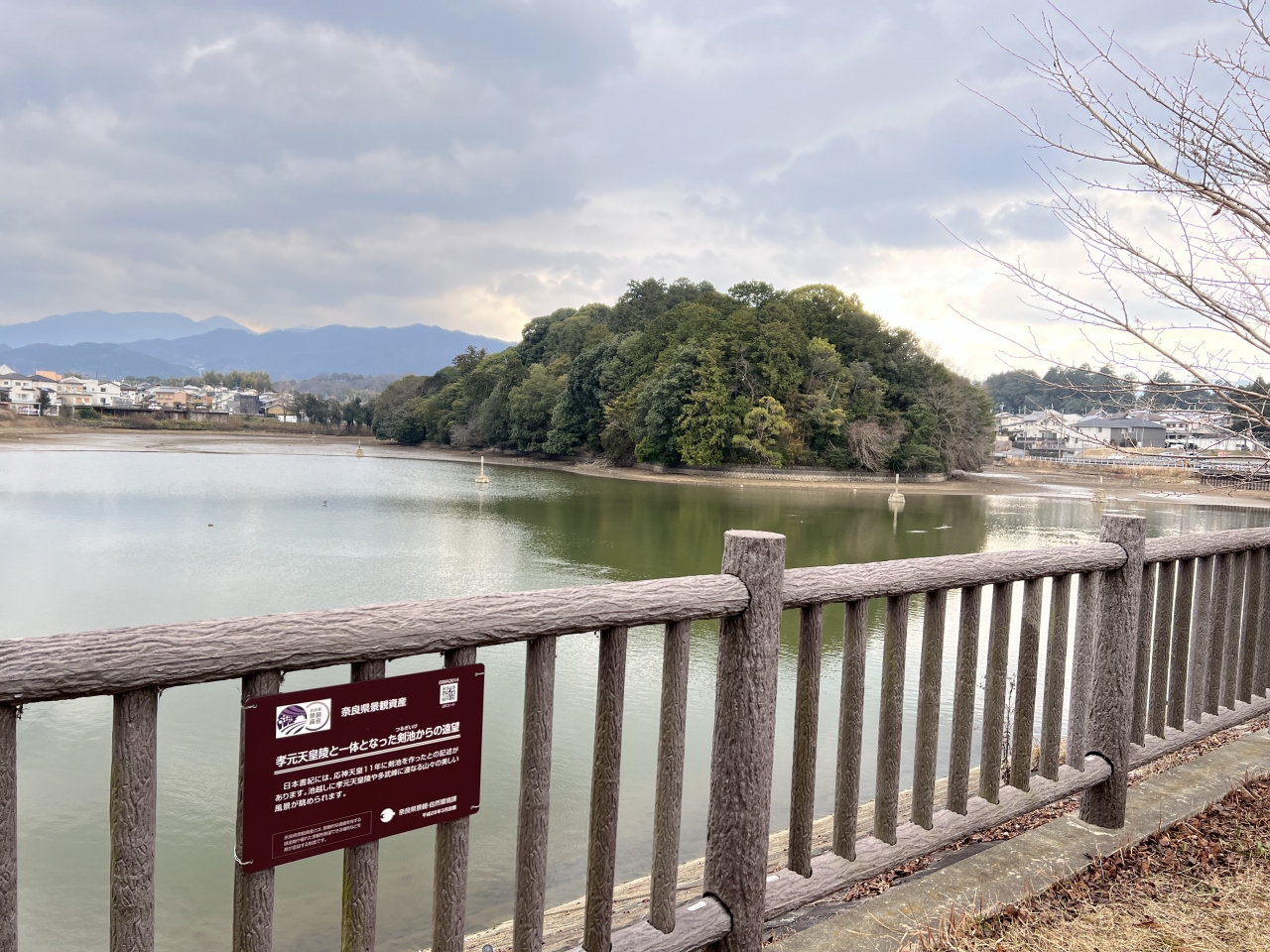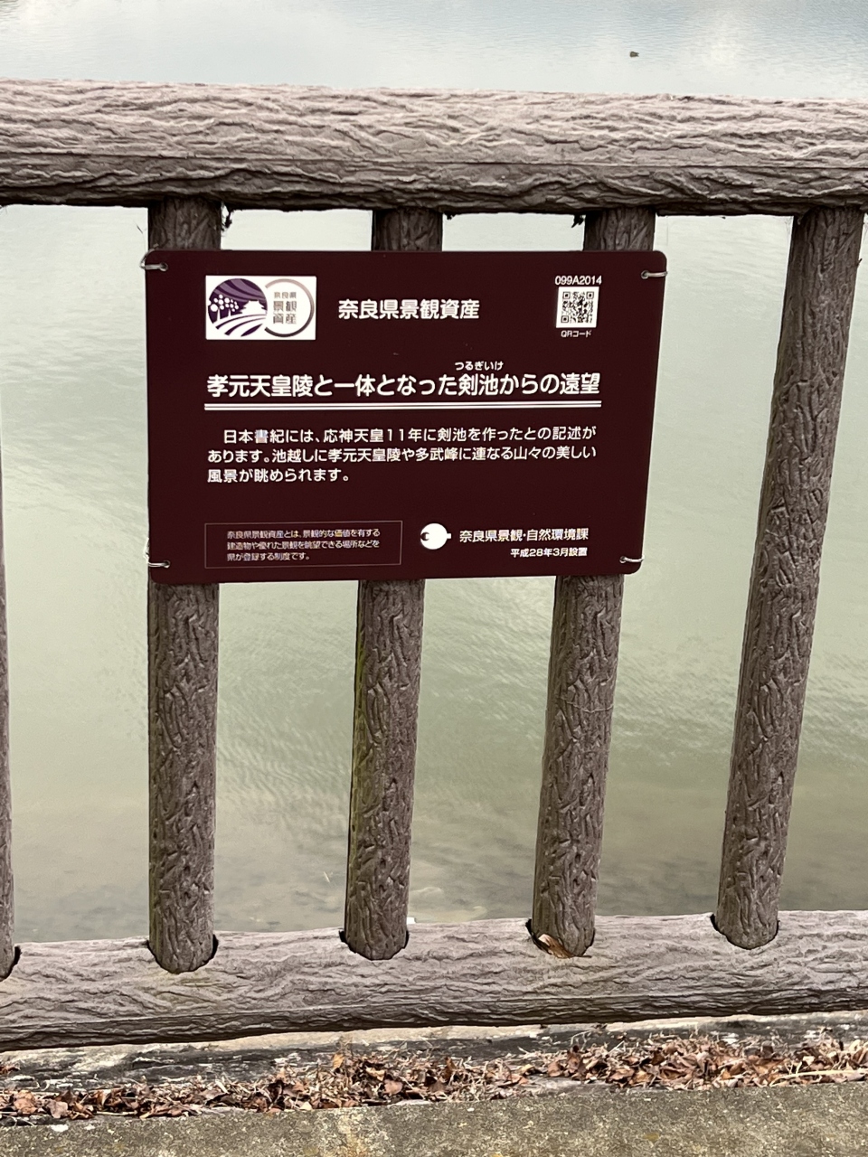 橿原駅からは15分ぐらい歩きます。陵の入り口は池を回りこんだところにあるのでさらに5分ぐらいかかります。池の手前側の柵に、「孝元天皇陵と一体となった剣池からの遠望」というプレートが設置されており、確かに池と陵、山々の景色は絵になると思いました。
