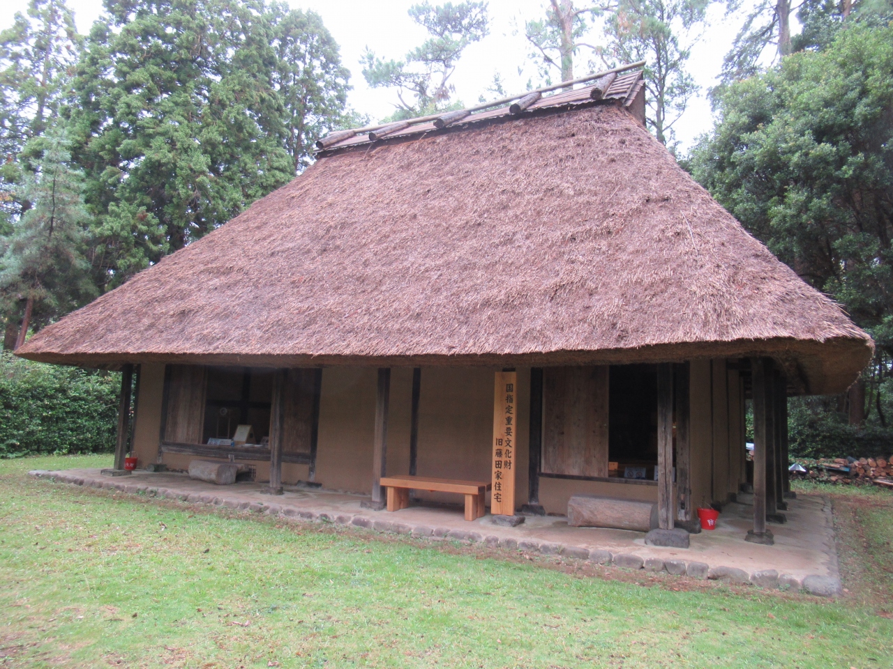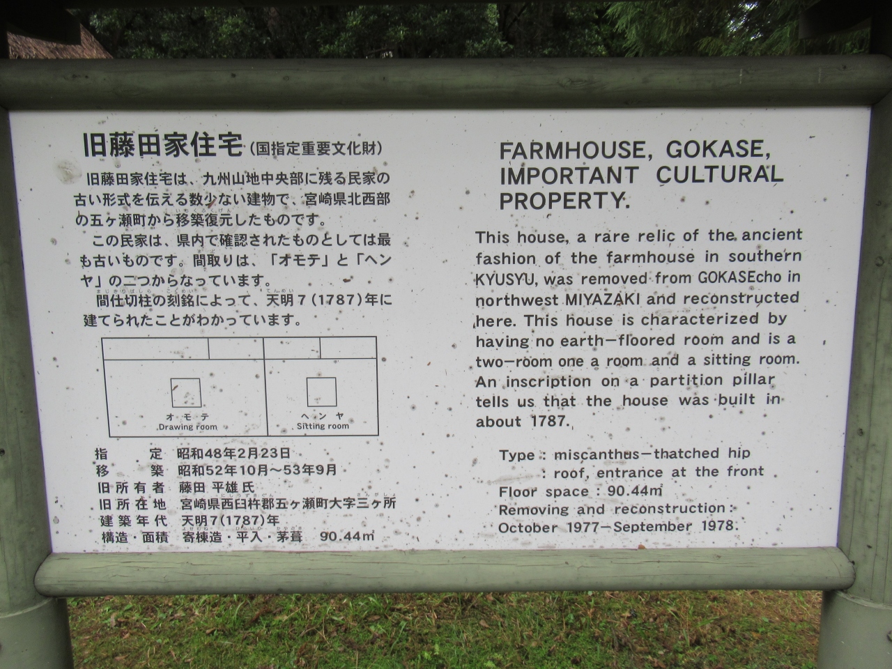 藤田家住宅は、九州山地中央部に残る民家の古い形式を伝える数少ない建物で、宮崎県北西部五ヶ瀬町から移築復元したものだそうで、国の重要文化財となっています。