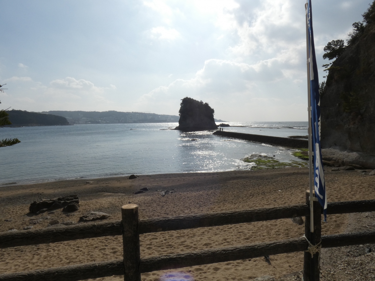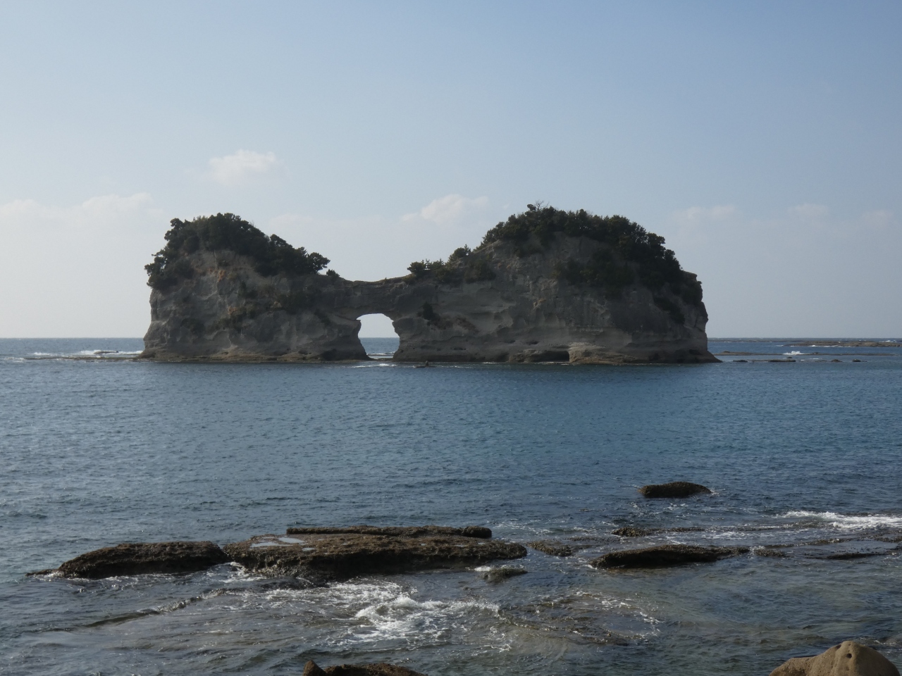 白良浜の北方に位置する、白浜のシンボルとして親しまれている小島。正式名称は「高嶋」と言い、臨海浦の南海上に浮かぶ南北130m、東西35m、高さ25mの島です。島の中央が円月形の海蝕洞が開いている事から名付けられています。三段壁・千畳敷・円月島の名称で国の名勝に指定され、夕日が沈む美しさは格別で和歌山県の夕日百選に選ばれています。