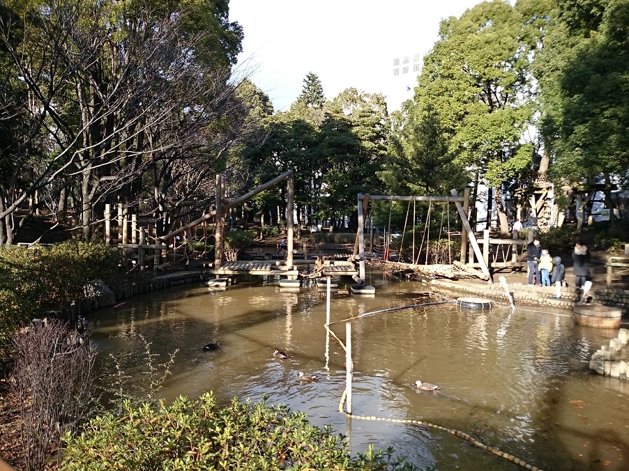 京浜急行平和島駅から徒歩15分程度、かつて存在した平和島運河を埋め立てて整備した大田区立の公園です。昭和57年(1982年)の開園で、フィールドアスレチック、テニスコート、弓道場などの運動施設のほかに広場や池もありました。隣接して大森ふるさとの浜辺公園や、平和島公園があり、この辺り一帯が緑と水の多い地域になっています。