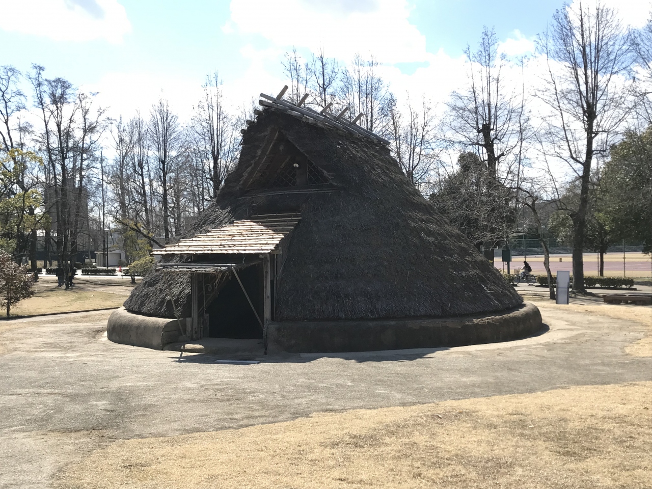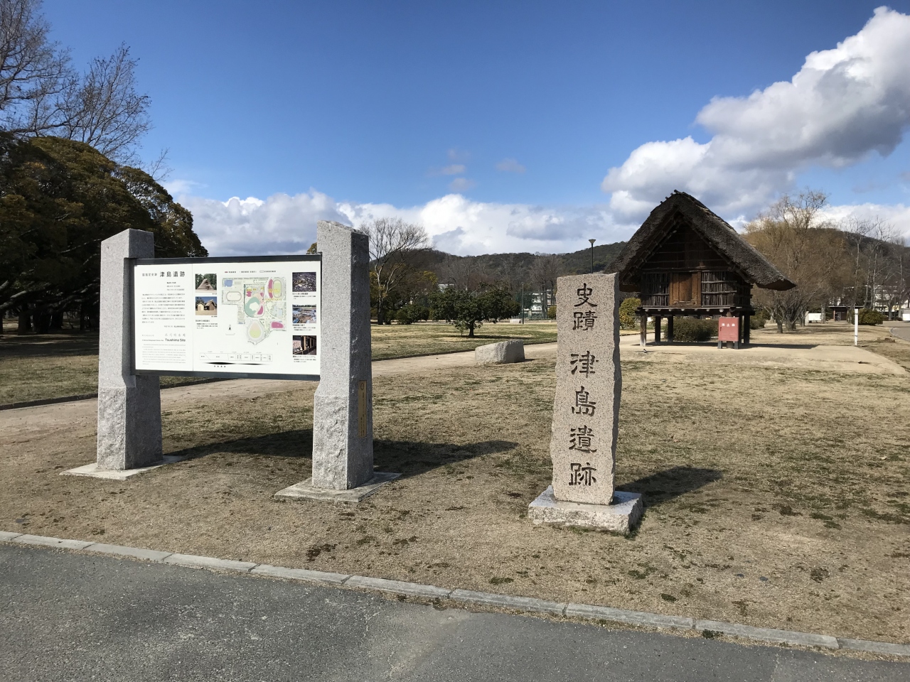 津島遺跡は、岡山市内の岡山県総合グラウンド一角にあります。昭和43年の発掘調査で弥生時代初め頃の集落と水田が全国で初めて一緒に見つかったそうです。平地に復元された竪穴式住居や高床式の倉庫が並んでいました。実際には地下3m付近に実際の遺跡が広がっていたようです。歴史ロマンを感じられる場所でした。