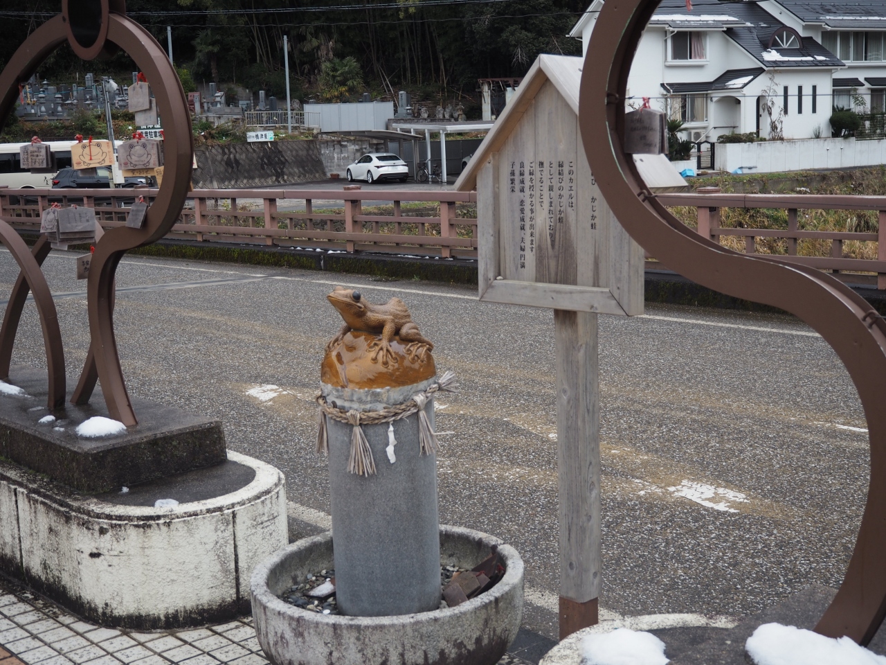 三朝温泉のなかほどにある三朝橋から一つ上流側にある橋が恋谷橋です。橋の中央部にはかじかガエルのオブジェがあります。このかじかガエルには恋の成就の御利益があるそうで、かじかガエルを撫でるといいそうで、みんなが撫でるためでしょうかカエルの像はピカピカに光っていました。夏場は川沿いにはカエルの声がよく聞こえるそうです。