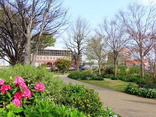 赤レンガパークからワールドポーターズ方面へ移動するときに通りかかりました。芝生が広がり色とりどりの花が植えられていました。そもそも赤レンガパークが広々としているので、すぐとなりに広がる緑地は開発までの暫定的なスペースなのかな? というのが正直な印象でした。