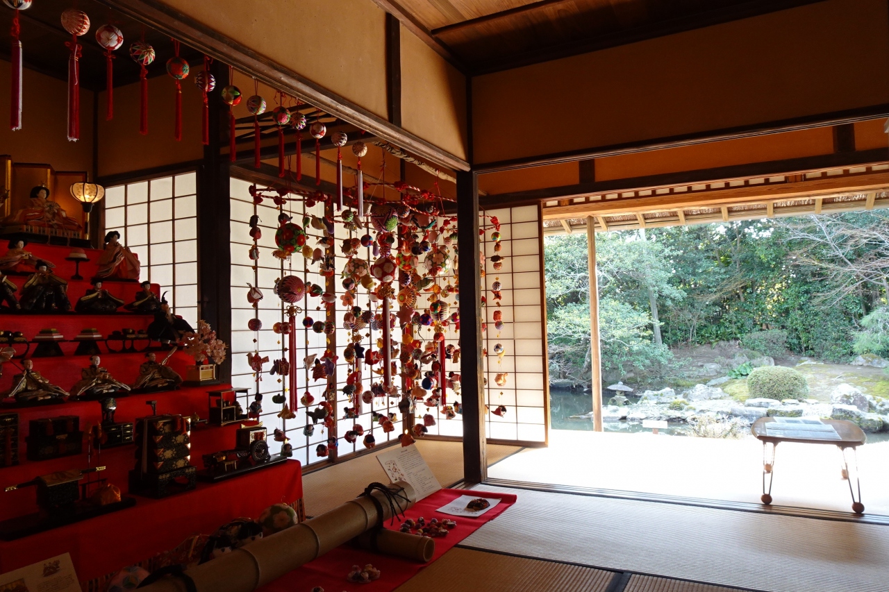 さげもんの時期は庭園を望むお座敷に色とりどりのさげもんが飾られ、とても優雅です。