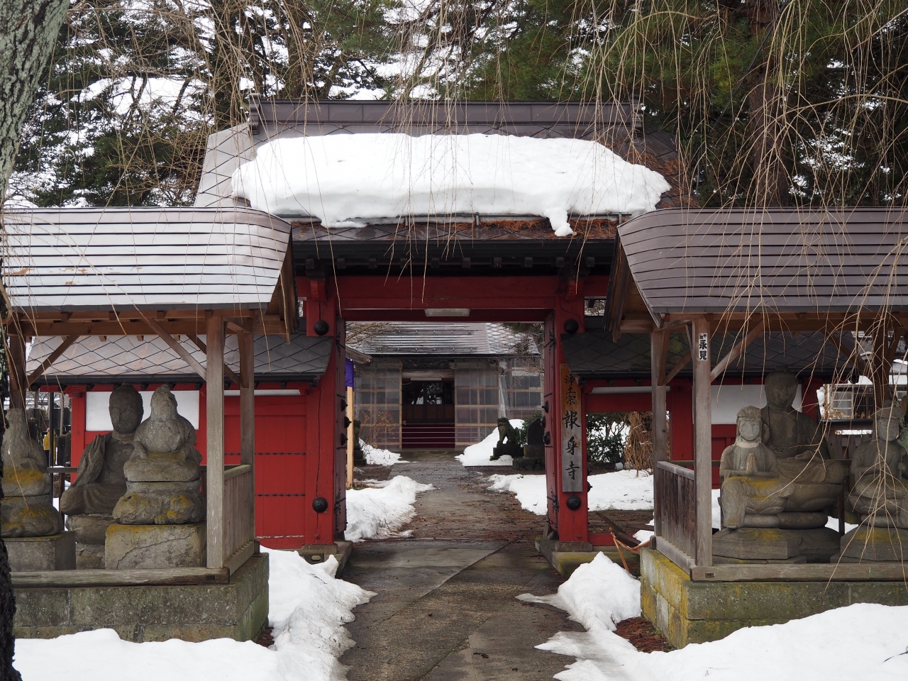 報身寺は角館の市街地にある武家屋敷の西宮家から桧木内川へと歩いて行った場所にあります。となりは薬師寺があります。報身寺は鳥居をくぐり参道を歩くと、赤い山門がありその奥にこじんまりとした本堂があります。山門の手前に左右に3体の石仏があります。江戸時代には藩主の庇護を受けて厚い信仰を集めていたそうです。