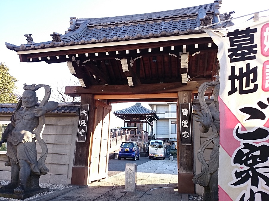 JR赤羽駅から徒歩20分程度、北区赤羽西6丁目に建つ日蓮宗の寺院です。江戸時代初期の寛永6年(1629年)文京区向丘に創建され、関東大震災で被害を受けて大正14年(1925年)現在の場所に移転したそうです。お墓が屋内にある都市型寺院になっています。山門前に立っている2体の仁王像が印象的な寺院です。