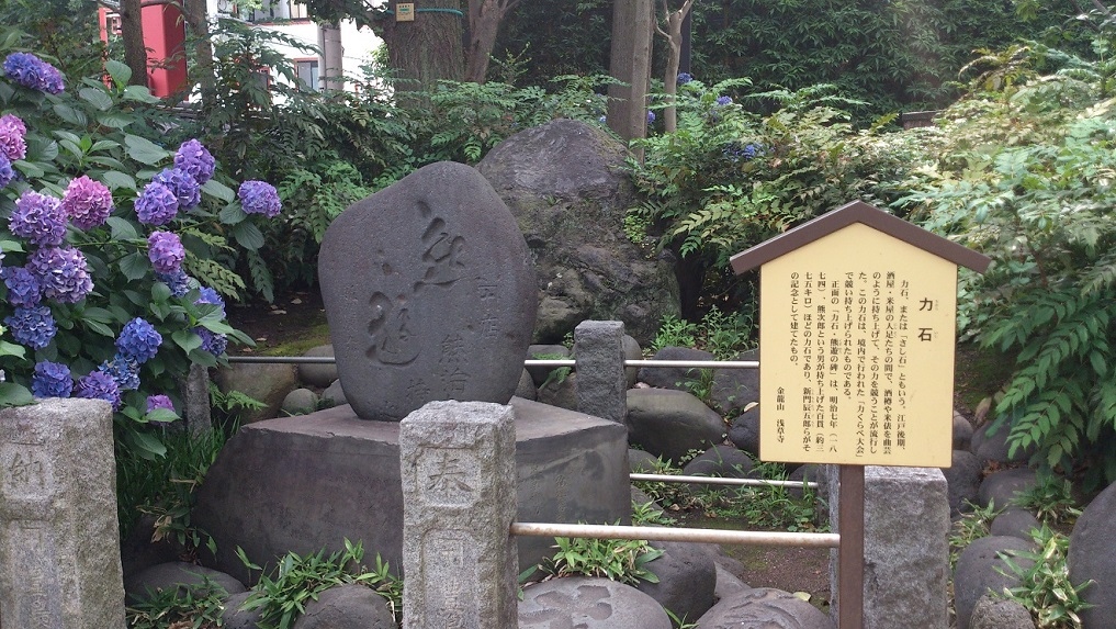 台東区浅草、浅草寺の五重塔脇の新奥山と呼ばれるところに立っています。2021年6月、浅草散策時に立ち寄りました。江戸時代、酒樽や米俵を持ち上げて、その力を競う事が流行し、ここにある石は、浅草寺境内で行われた力比べ大会で実際に使われた石だそうです。重さは約百貫(375kg)との事。