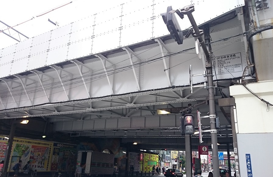 架道橋とは道路や線路の上をまたぐように架かっている橋の事で、切通橋架道橋はJR御徒町駅前の春日通りをまたいでいるJR線路の橋です。合計7本の線路が通っていて、最初の架橋は大正13年(1924年)なのだそうです。アメ横へ行く時など何気なく下をくぐっていた橋ですが、100年近くも前に架けられた橋だったのですね。