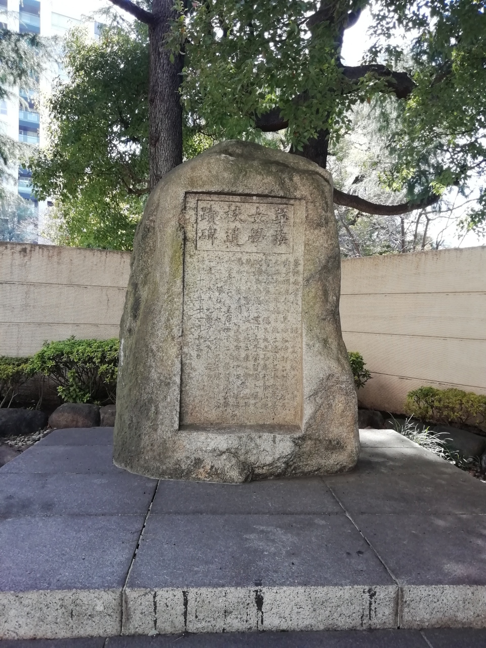 永田町の衆議院議長公邸の門のそばに立っていました。道路に面していて、割と大きな石碑なのですぐに分かると思います。門の中には警備員の詰め所がありましたが、こちらは門の外です。この場所に華族女学校があったのですね。今の学習院の女子部の始まりです。