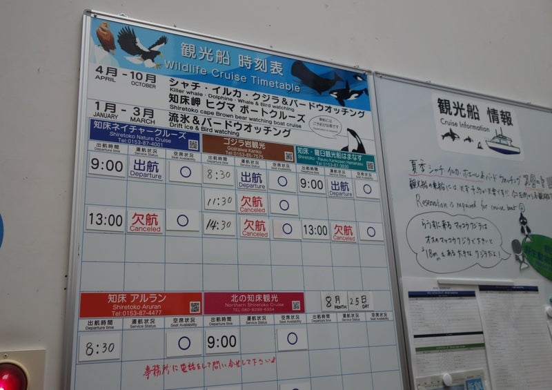 羅臼クルーズが出航か欠航か、こちらにボードが出ていました