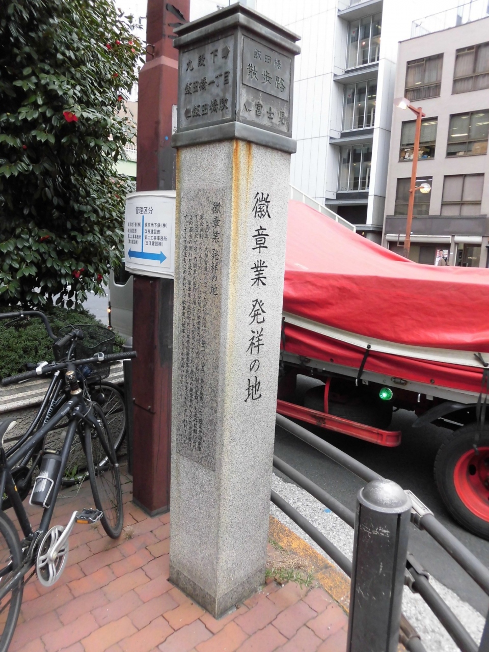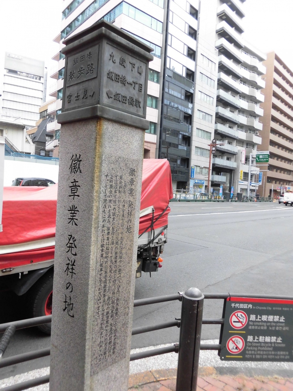 九段下駅からJR飯田橋駅に向かって散策しているときに、道路わきの植え込みの中に案内柱が立っていたので立ち寄りました。微章業発祥の地と刻まれていて、最初はどんな業種なのかわかりませんでしたが、どうやら勲章とかバッチの製造業とのことでした。とても特殊な製品なので、いったいどのように作られているのか、一度みてみたいと思いました。