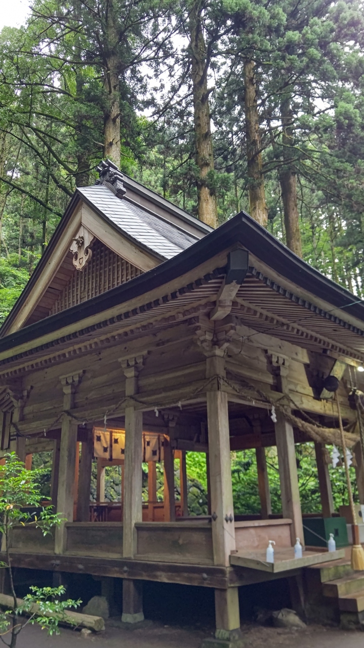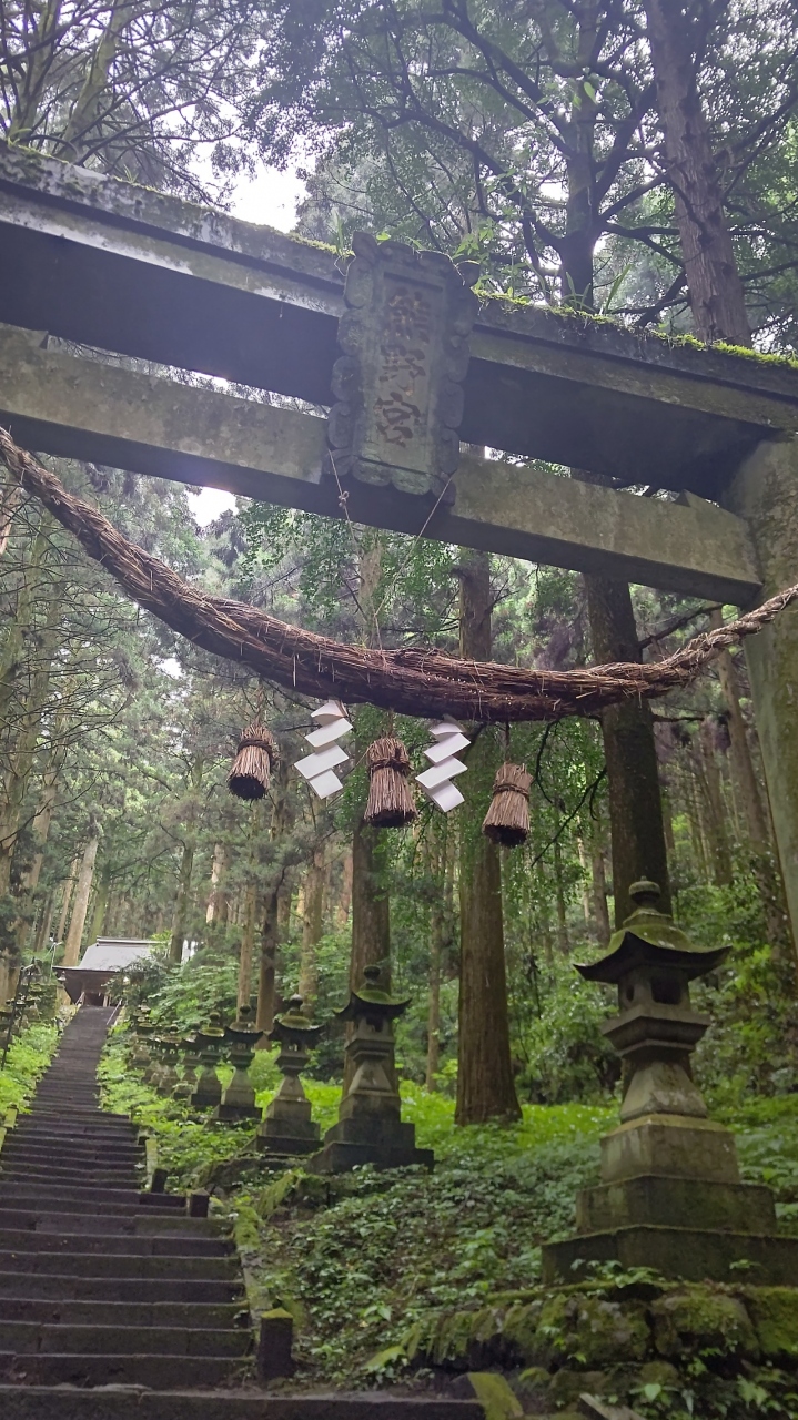 阿蘇の美しい自然に囲まれ100基を越えるであろう燈籠が並ぶ苔むした参道は壮観な景色です。空に向かって真っ直ぐに伸びる杉林に囲まれた階段は見上げると一瞬登る気持ちが怯むくらいの長さですが実際に登ってみると杉林の気持ち良さの方が勝ちあまり辛さは感じませんでした。本殿の更に上には穿戸岩と言う大きな風穴があく巨石があり合格や必勝のご利益があるそうです。