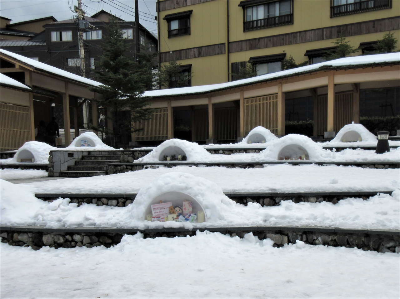 訪れたときは雪が積もっていて、その雪を使っていくつもの小さな「かまくら」がたくさん作られていました。「かまくら」の中には、ひとつひとつに何かが入っていました。どうも、参加した企業、商店などの特徴を表す小物のようでした。中身はどうあれ、遠景で見ていて、気持ちがホッコリしました。