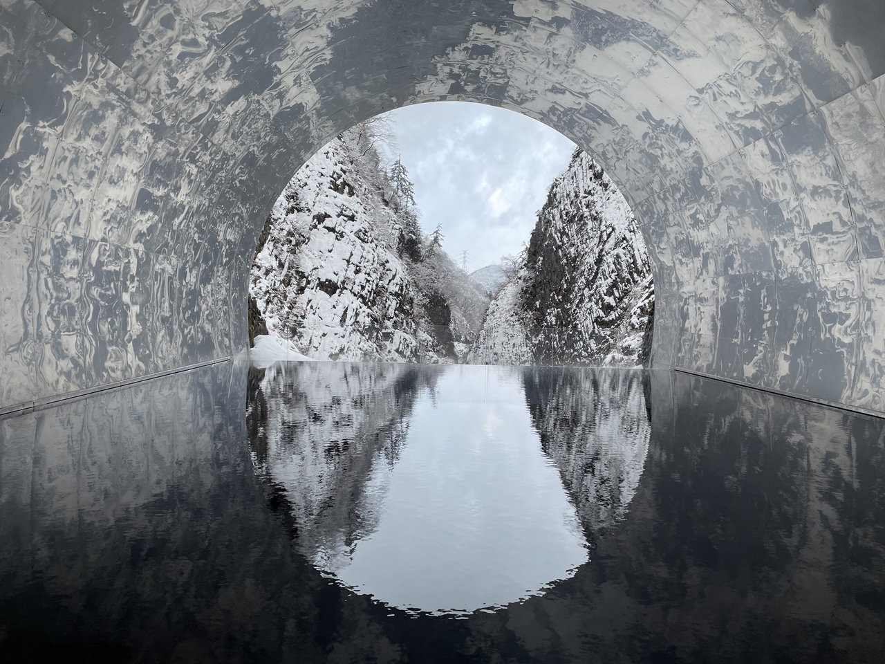 年末の雪の降る日に訪れたので、寒さと暗さと人の少なさで少し不気味でした。アートの音声とか照明の色が不気味さを一層高めていました。所々にある外を見られる場所は清津峡のモノクロのきれいな景色が見れました。最後の水鏡のところは白黒の世界かとてもきれいでした。