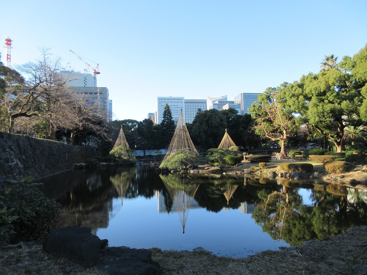 日比谷公園の有楽町にほど近い北東側の入口から入り、【日比谷見附跡】を通り抜けると南側に向かって緑の木々に囲まれた大きな池があり、それが【心字池】でした。歴史を感じさせる落ち着いた雰囲気を醸し出していました。石垣と池、そして緑の木々が織りなす景観は一見の価値があると思いました。