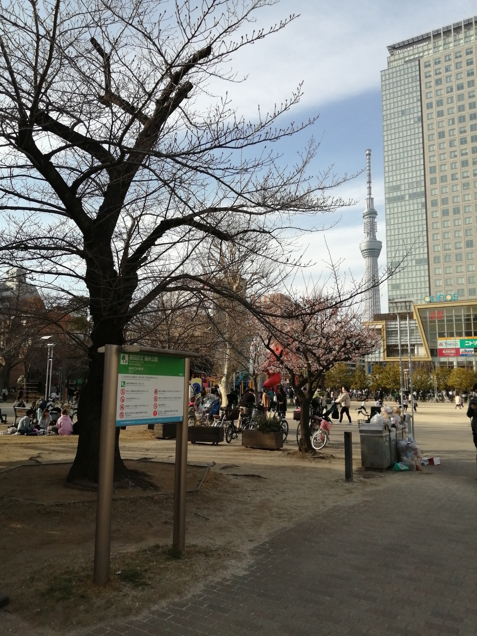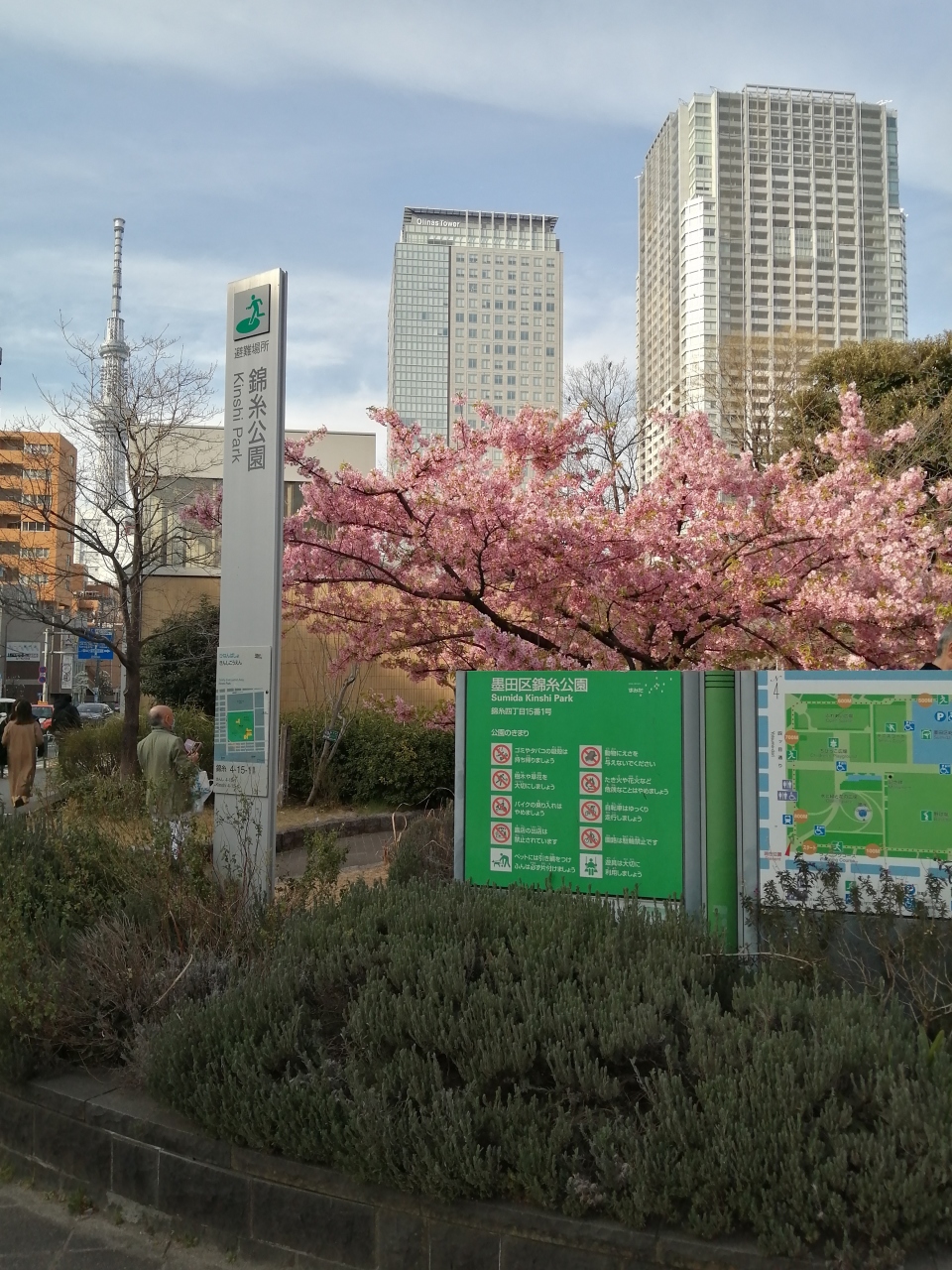 3月上旬、錦糸公園に行ったら、ちょうど入口のところに早咲きの桜がピンク色の花を咲かせていて、大勢の人が写真を撮っていました。公園自体は広いはずなのに、来ている人の人数がはんぱなかったので、むしろ狭苦しく感じるくらいでした。