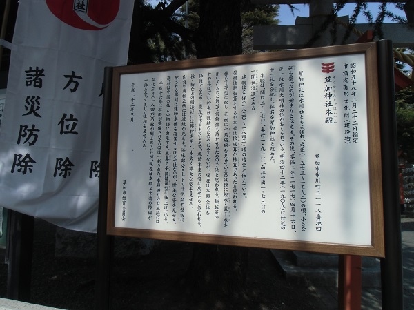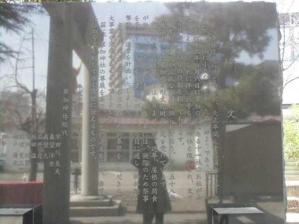 説明碑文によると、草加神社(旧氷川神社)は安土桃山時代(天正年間頃)に、武蔵國三之宮なる大宮氷川神社の御霊を分け戴きて小祀を祭りしに起縁します。