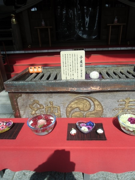 手水舎の水や本殿前の賽銭箱の前に置かれたガラスの器に綺麗な花が浮いていました。