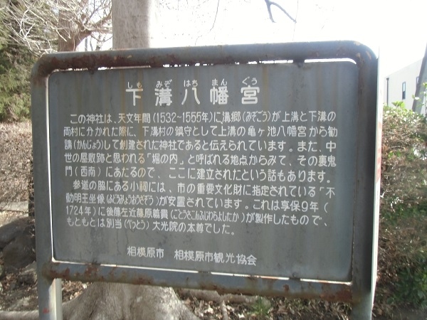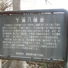 説明板によると、天文年間(1532~1555)に溝郷が上溝と下溝の両村に分かれた際に、下溝村の鎮守として上溝の亀ヶ池八幡宮から勧請して創建された神社であると伝えられています。