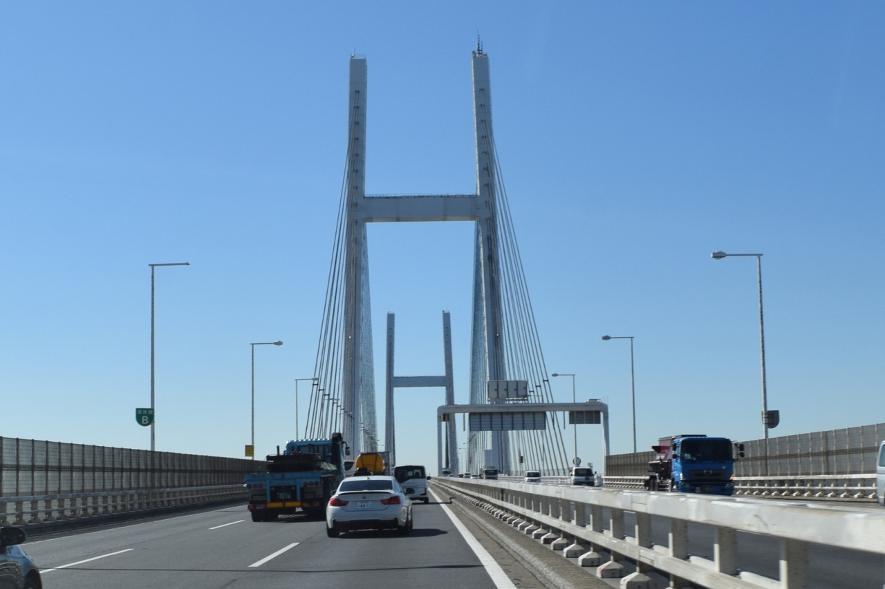 首都高速道路湾岸線で横浜港を通過する際にベイブリッジを渡ることになります。横浜港の遊覧船から見ても美しく大きな吊り橋ですが車で走行すると支柱の巨大さが感じられます。