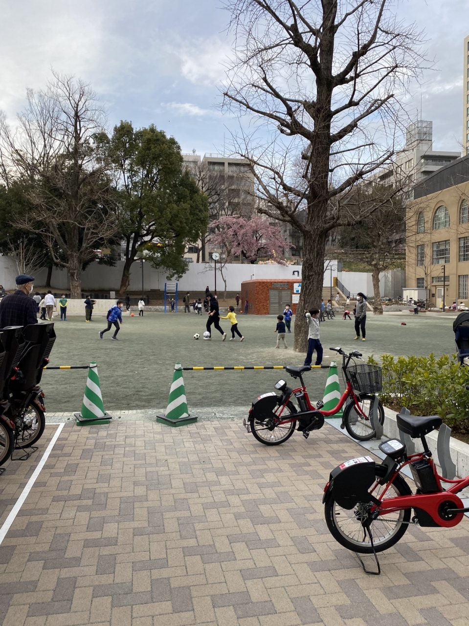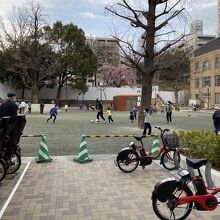千代田小学校の前の公園。チヨクルのサイクルポートがあってよく遊びに行きます。遊具などはほとんどありませんが、土日はかなり混んでいます。視界を遮るものもないので、どこにいても子どもたちが見えるのは安心。