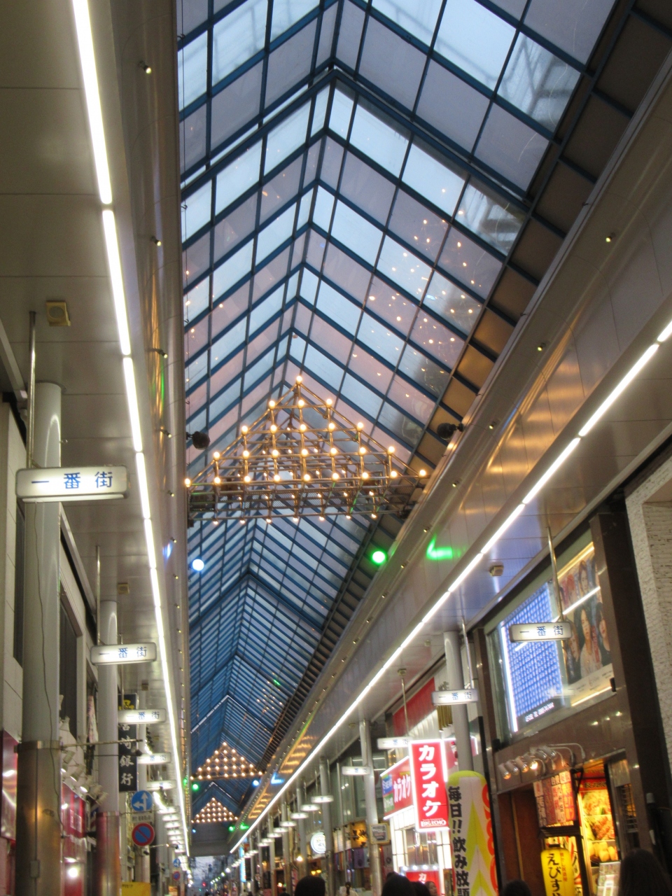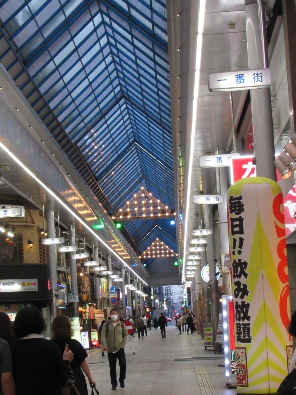 宮崎市の一番街商店街は、宮崎のメインストリートである橘通りの宮崎駅へ向かう橘通3丁目交差点から100mほど南に、西向きにあるアーケード商店街で、橘通の交差点を渡った東側は若草通り商店街です。