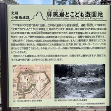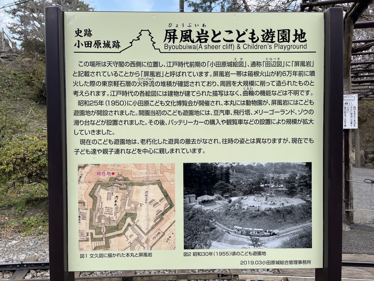 小田原城の天守のそばにある小さい遊園地です。小さい子ども向けの乗り物があり、手ごろな料金で利用できるようになっていました。そばには説明も書かれていて、屏風岩という歴史のある場所だということもわかり、勉強になりました。