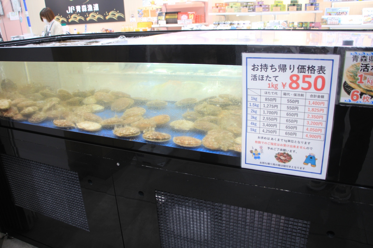 青森空港内にある漁協関連のショップです。ホタテのいけすがあるところが漁協らしく良いと思います。青森県を出発する前に青森県の特産品の海産物を購入するのも悪くないと思われます。海産物以外のお土産品も取り扱っています。