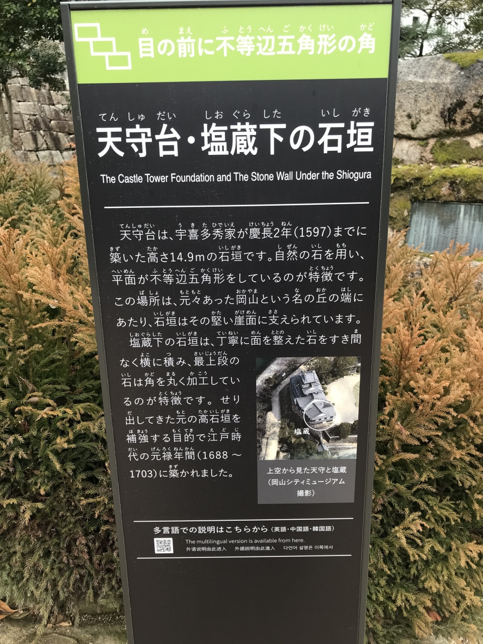 烏城公園は、岡山城本丸跡を歴史散策ができるように整備された公園です。天守閣は戦後再建されたものですが、月見櫓は築城当時から唯一現存している建物です。残されている石垣にも色々な時代のものがあり、説明看板を参考にして見学しました。