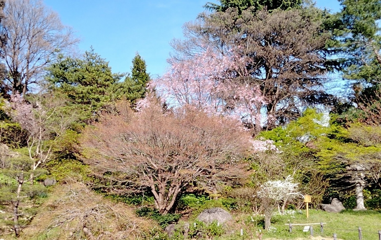 西郷隆盛の弟、西郷従道の所有地を目黒区が取得してできた公園です。西郷従道時代に名園と言われた日本庭園が復元されていて、見どころとなっています。庭園内には鹿児島県から贈られたしだれ桜もあり、満開になっていました。