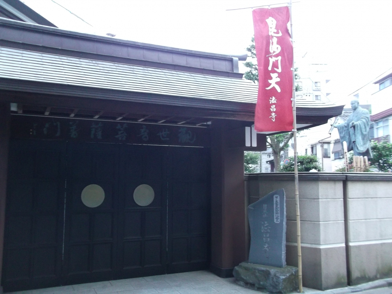 日比谷線入谷駅から歩いて3分ほど、住宅に囲まれた中にある法華宗の寺院です。夕方で門は閉じていて中はうかがい知ることはできませんでしたが、塀の高さから超えて見える本堂はかなり立派な造りのように思えました。下谷七福神の毘沙門天が祀られていて、門の前にはそののぼりが立っていました。