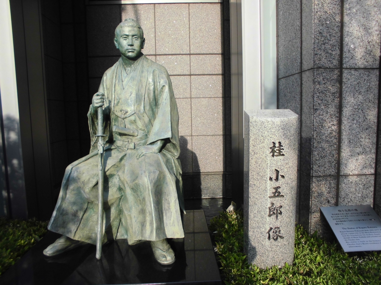 京都市役所に近い旧長州藩邸跡にあります。刀を持って椅子に座る形の像で、京都市役所を向いて座っています。まるで桂小五郎が京都市政を監視しているかのようです。目立たない場所にありますが、存在感は確かにありました。