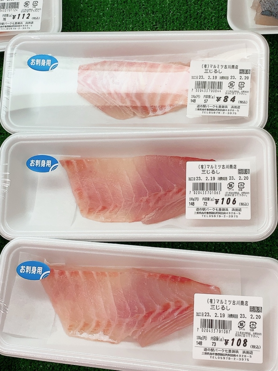 お魚屋さんも入っていて、今まで見た中で1番安いお刺身を買いました。 三重の方言のようですが、"三じるし"という鯛のお刺身でしたが、コリコリしててめっちゃ美味しかったです! あまりにも安くてもしかして美味しくないのか?と思ってしまい1パックしか買わなかったのですが、もっとたくさん買って帰れば良かった!と思うほどでした。